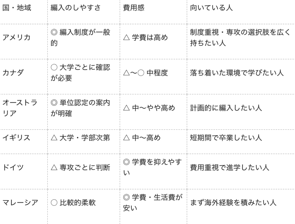 まずは志望国と候補大学をいくつか挙げ、それぞれの条件と編入ルートを比較しながら、自分に合った進学計画を立てていきましょう。